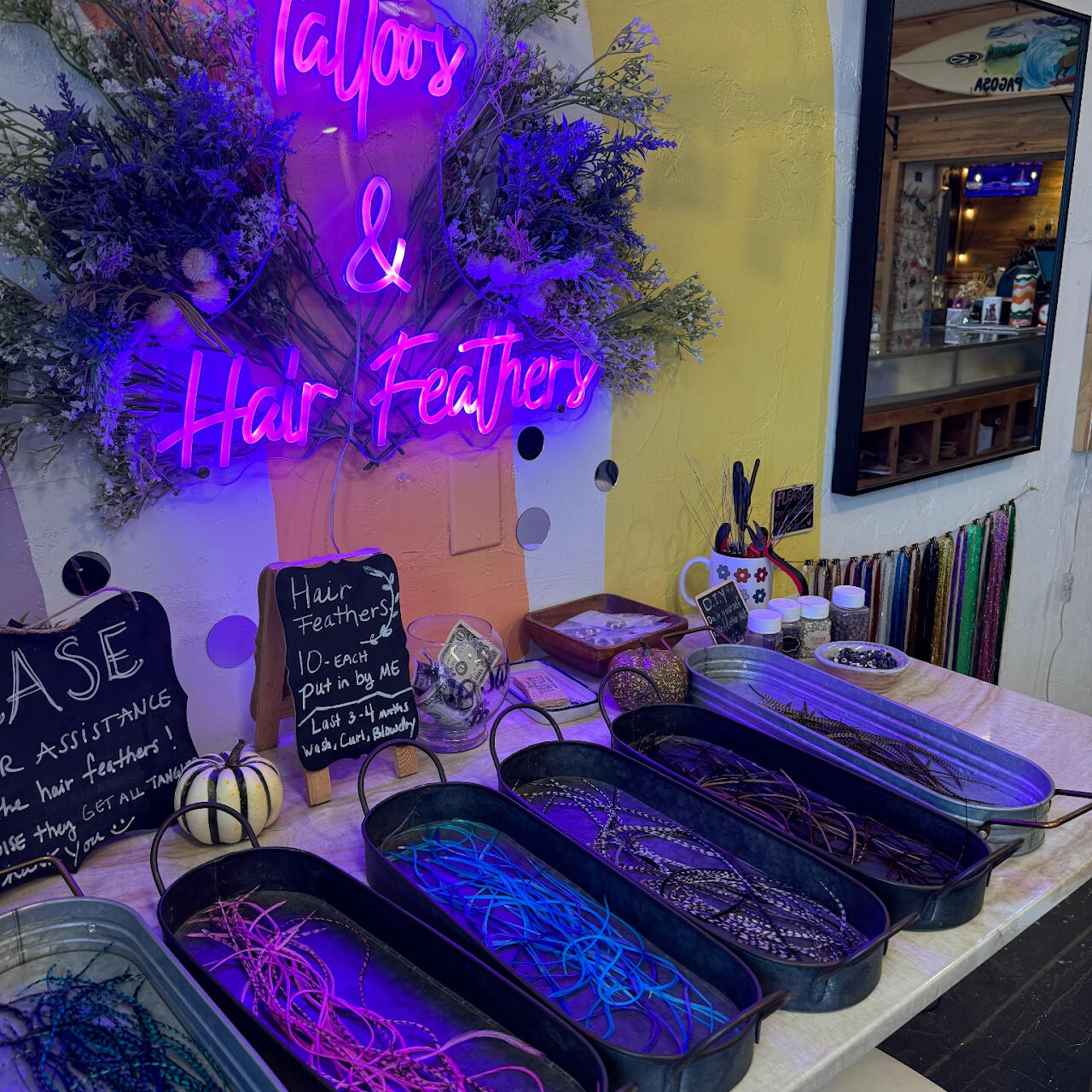 We also offer hair feathers, tinsel, temporary tattoos, and custom face masks for added flair and fun.
